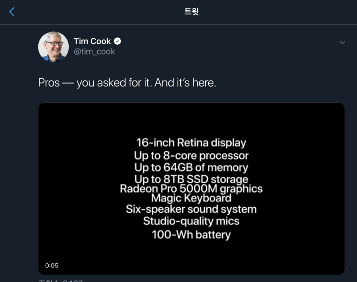 팀쿡 트윗을 기점으로 정보들이 쏟아져 나오기 시작했다 어제 팀쿡의 트위터를 기점으로 앰바고로 제한되어있던 16인치 정보들이 쏟아져 나오기 시작했습니다.
