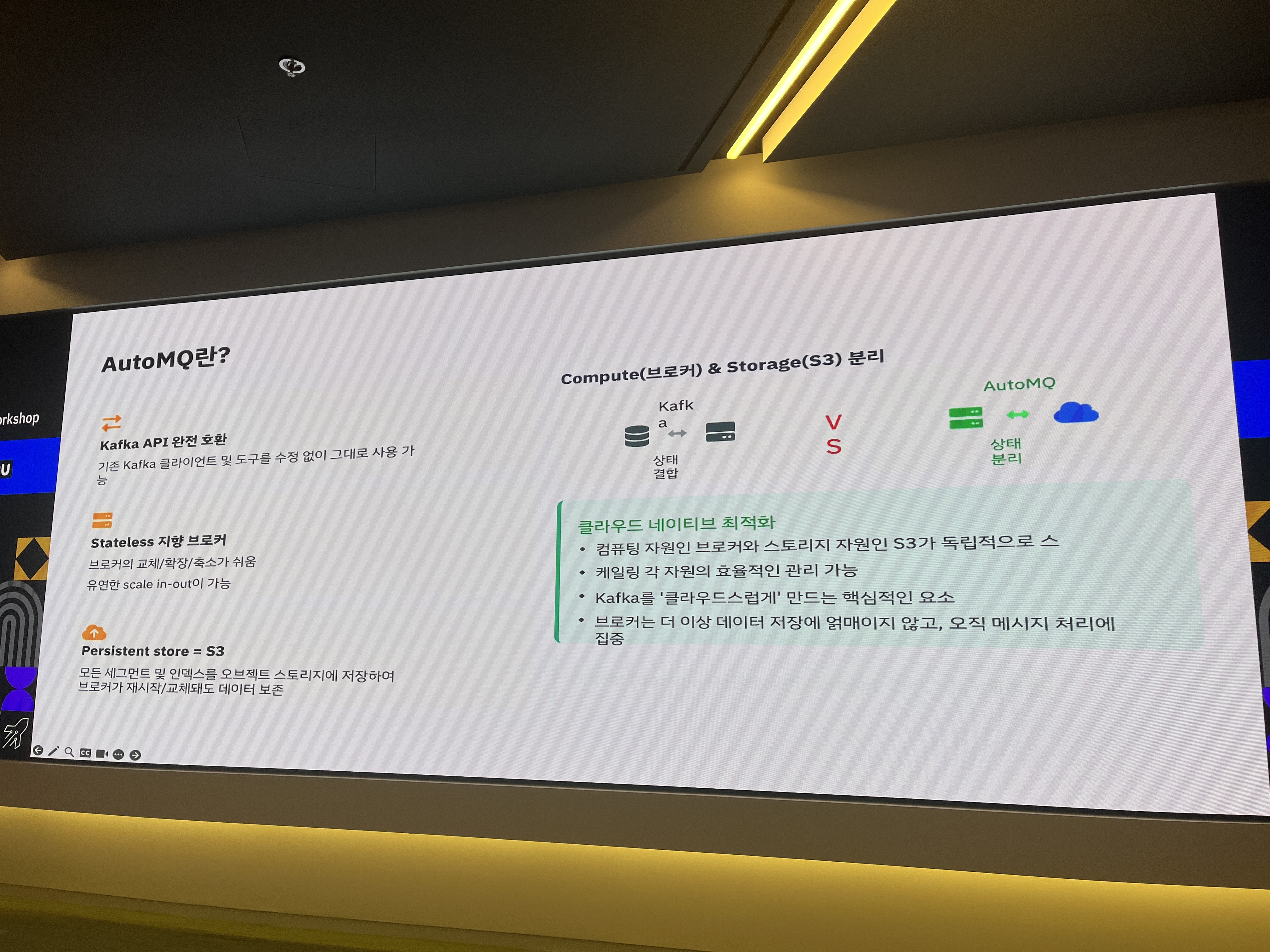 지난 9일에 여의도 IFC Three 건물에서카프카 밋업을 진행했다. 내가 들어가있는 카프카 오픈 채팅방에서 관련 공지가 떠서 확인했는데 때마침 내가 관심있어하는 주제인 AutoMQ와 아이스버그에 관련된 세션이 있어서 기대를 가지고 바로 신청했다. 커뮤니티나 채팅방에 제법 회원수가 있었고 35명만 뽑는 자리라서 제법 경쟁이 치열했지만 참가비 5000원을 바로 결제를 하고 다행이 참가 확정 안내 메일을 받아볼 수 있었다. 막상 참석하고보니 자리도 꽤 여유로웠고 참석하지 않은 사람도 있어서 좀더 규모있게 진행되었어도 괜찮겠다는 생각이 들었다.